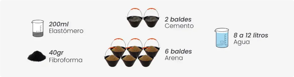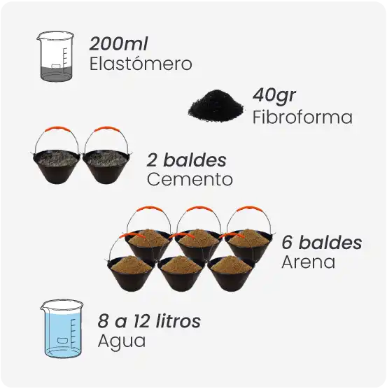 En una hormigonera mezclar: 2 baldes de albañil de cemento, 6 baldes de albañil de arena, 200ml de elastómero, 40gr de fibras de neumático reciclado Fibroforma, 8 a 12lt de agua.